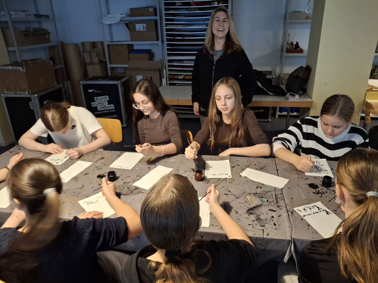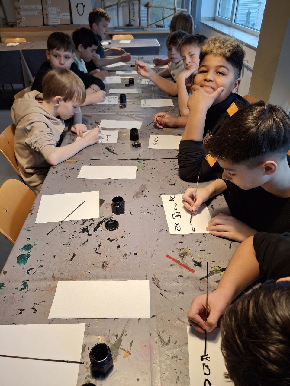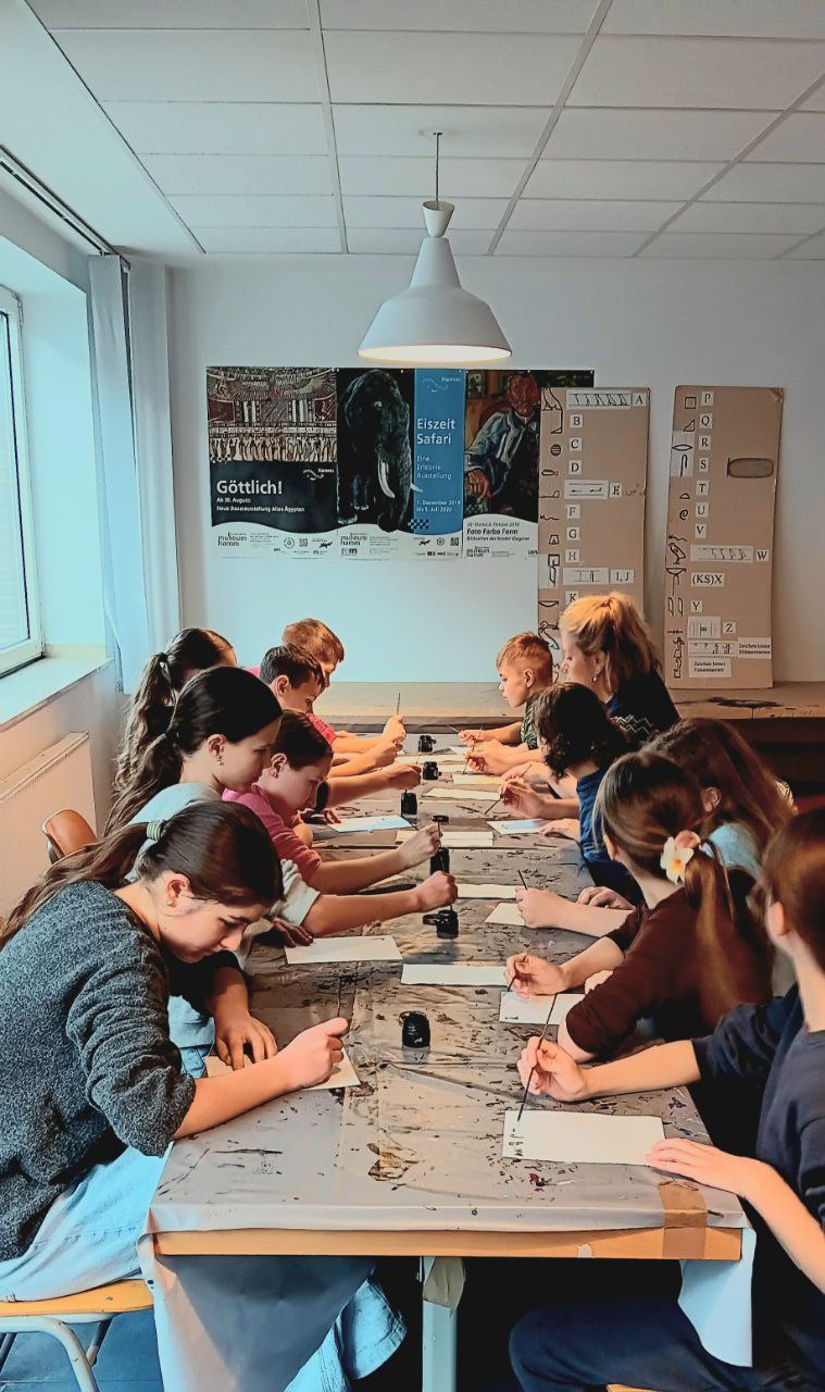 Nach der Führung folgte ein kreativer Teil, der für strahlende Augen sorgte: In den Räumen der Museumspädagogik durften die Schülerinnen und Schüler ihren eigenen Namen mit speziellen Holzgriffeln und schwarzer Tusche in Hieroglyphen auf echtem Papyrus gestalten. „Es war spannend zu sehen, wie die Schriftzeichen aufgebaut sind – und hat dann total Spaß gemacht, dass man seinen eigenen Namen wie ein ägyptischer Schreiber aufgeschrieben kann!“, berichtete ein Schüler stolz.