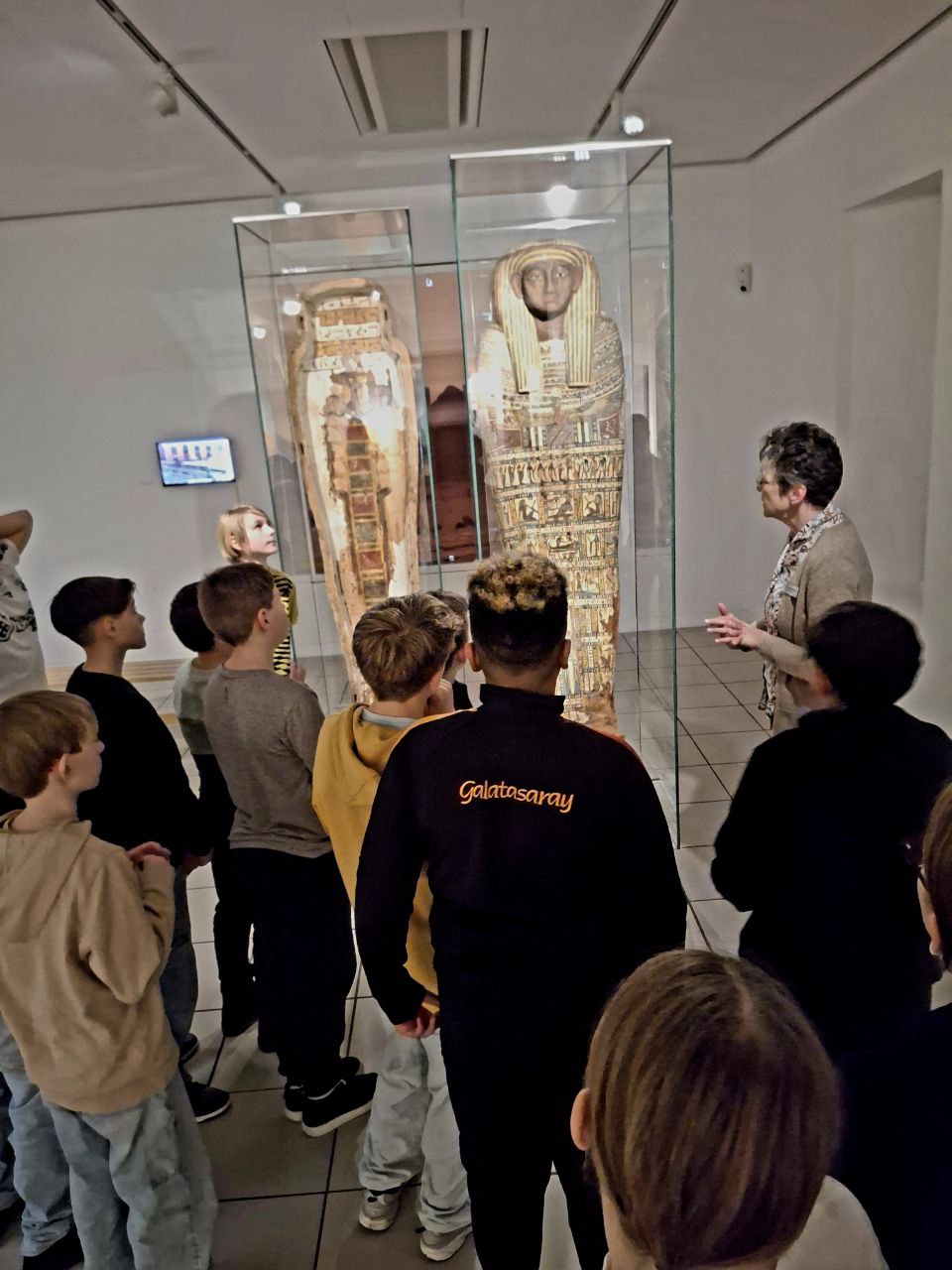 Schon beim Betreten der Ausstellung staunten viele über die detailreichen Exponate. „Ich hätte nie gedacht, dass die Mumienmasken so gut erhalten sind – das war richtig beeindruckend!“, erzählte eine Schülerin begeistert. Die Museumspädagoginnen erklärten anschaulich den Alltag im alten Ägypten, die Bedeutung der Götterwelt und die Geheimnisse der Hieroglyphenschrift. Bis zu 4000 Jahre alte Originalfunde konnten aus nächster Nähe betrachtet werden, was die Zeit der Pharaonen für die Kinder besonders greifbar machte.