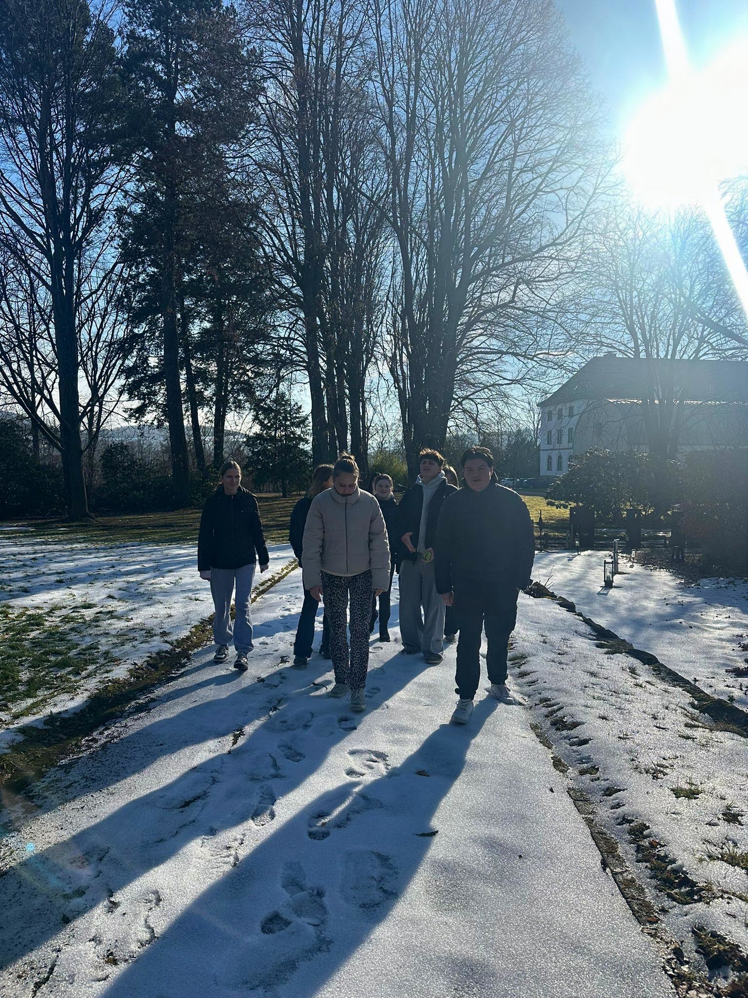 Von Mittwoch bis Freitag verbrachten wir unsere Besinnungstage auf dem Klosterberg in Meschede – und nein, sie waren alles andere als langweilig. Begleitet wurden wir von Frau Schulz-Garbe, die an den thematischen Einheiten leider nicht teilnehmen durfte. Diese wurden hingegen von Bruder Anno und Petra geleitet, die schon nach kurzer Zeit nur noch „Power Petra“ genannt wurde. Los ging es am Mittwoch mit der Mittagshore mit anschließendem gemeinsamen Essen und der Zimmereinteilung. Danach lernten wir uns bei verschiedenen Spielen besser kennen, unter anderem bei „Ich packe meinen Koffer“, bei dem kreative Adjektive zu unseren Namen erfunden wurden. So entstand z.B. auch der sehr einprägsame Name „Massiver Marcel“ für einen langen Menschen aus unserer Runde. Außerdem erstellten wir gegenseitig Steckbriefe, redeten und spielten viel und ließen anschließend den Abend entspannt ausklingen – wahlweise privat oder – wer wollte – mit der Abendmesse und danach bei Gesprächen im Leseraum über Gott und die Welt. Natürlich wurde auch die wichtigste Frage der Gourmets unter uns ausführlich behandelt: Was ist eigentlich das beste Kartoffelgericht?