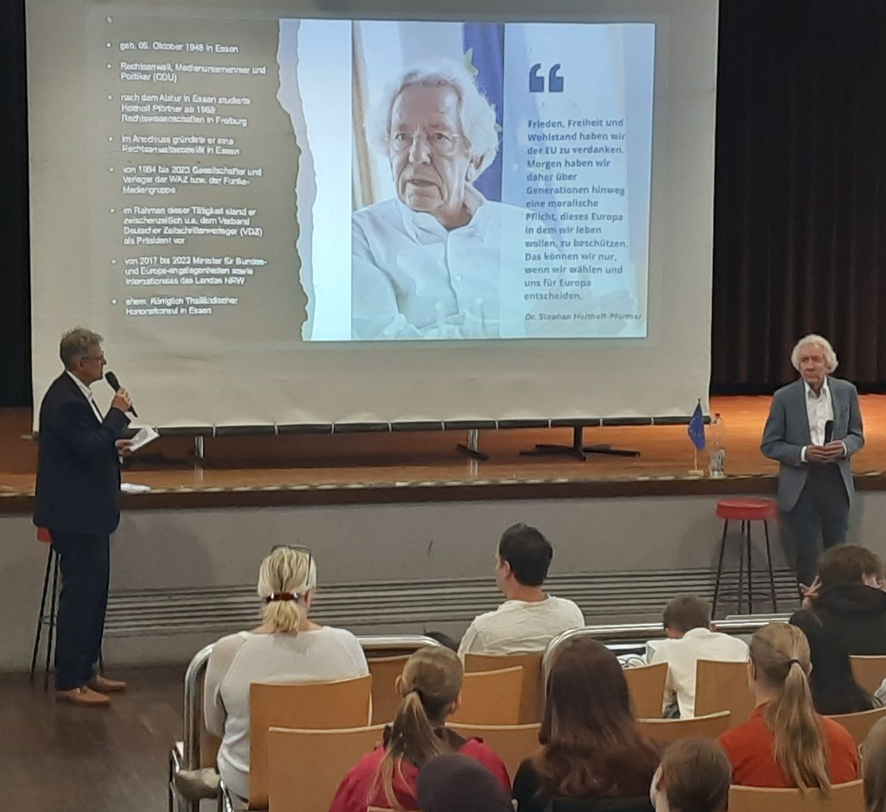 Dr. Stephan Holthoff-Pförtner – gebürtig aus Essen und damit tief im Ruhrgebiet verwurzelt – konnte in der Talk-Runde seine langjährige Erfahrung als Politiker, Rechtsanwalt und überzeugter Europäer einbringen. Besonders bewegend war sein Appell an die Schülerinnen und Schüler, die Europäische Union nicht als abstrakte Institution, sondern als Projekt der Menschen zu verstehen. Nicht die Mitgliedstaaten allein seien entscheidend für die Zukunft Europas, sondern vor allem die Bürgerinnen und Bürger – insbesondere die junge Generation. Als jemand, der aus einer Region kommt, die wie kaum eine andere vom europäischen Gedanken geprägt ist, verwies Holthoff-Pförtner auch auf die europäische Erfolgsgeschichte des Ruhrgebiets. Vom ehemaligen Kohle- und Stahlstandort hin zu einem Ort der kulturellen Vielfalt, der internationalen Zusammenarbeit und des wirtschaftlichen Wandels – auch das sei Europa, betonte er. „Wenn ich auf die EU-Karte blicke, erfüllt mich das mit Freude“, erklärte Holthoff-Pförtner. Für ihn sei sie ein Symbol des Friedens, der Partnerschaft und der gemeinsamen Verantwortung – eine Errungenschaft, die es zu verteidigen gelte. In diesem Zusammenhang sprach er sich auch klar für die Vision eines europäischen Bundesstaates aus – ein mutiger, aber aus seiner Sicht notwendiger Schritt zur Sicherung einer gemeinsamen, demokratischen Zukunft. Die Talk-Runde leistete einen wertvollen Beitrag zur politischen Bildung und zur Stärkung des europäischen Bewusstseins. Sie zeigte, dass politische Themen Jugendliche direkt betreffen – und dass sie bereit sind, sich einzubringen. „EU & Du – was geht, Europa?“ war damit nicht nur ein informativer Austausch, sondern ein eindrucksvolles Beispiel dafür, wie Demokratie und europäisches Denken bereits in der Schule lebendig werden können – gerade auch in einer Region wie dem Ruhrgebiet, in der Europa tagtäglich gelebt wird.