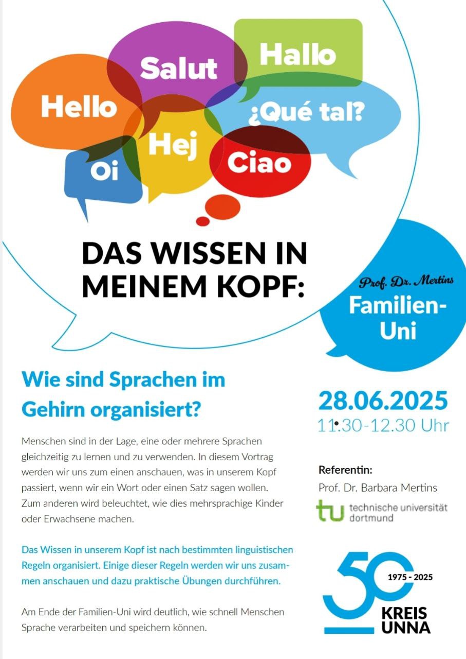 Am Tag der offenen Tür zum 50. Jubiläum des Kreises Unna findet eine Familien-Uni zum Thema Sprachen statt. Menschen sind in der Lage, eine oder mehrere Sprachen gleichzeitig zu lernen und zu verwenden. In diesem Vortrag werden wir uns zum einen anschauen, was in unserem Kopf passiert, wenn wir ein Wort oder einen Satz sagen wollen. Zum anderen wird beleuchtet, wie dies mehrsprachige Kinder oder Erwachsene machen. Das Wissen in unserem Kopf ist nach bestimmten linguistischen Regeln organisiert. Einige dieser Regeln werden wir uns zusammen anschauen und dazu praktische Übungen durchführen. Am Ende der Familien-Uni wird deutlich, wie schnell Menschen Sprache verarbeiten und speichern können.