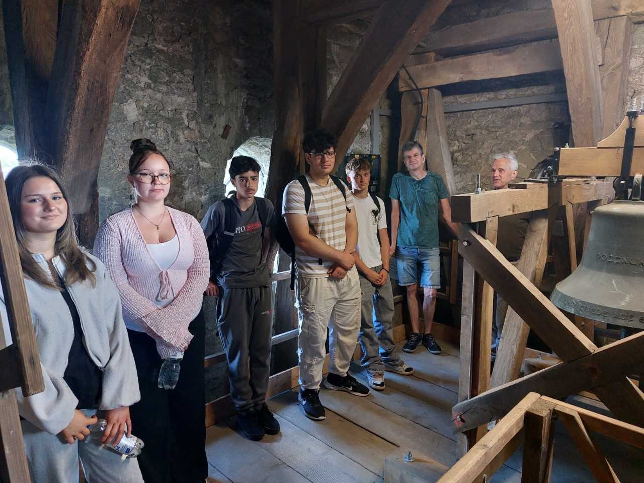 Ein Höhepunkt des Projekts war die Exkursion zur Alten Kirche in Bönen. Dort führte Matthias Overbeck die neugierigen Schüler:innen in den Glockenturm und erläuterte vor Ort ein konkretes Beispiel für dendrochronologische Untersuchungen. Die Projektgruppe bestaunte den mittelalterlichen Dachstuhl und konnte nun am Beispiel nachvollziehen, wie Fachleute aus wenigen Bohrkernen die Geschichte des Bauwerks rekonstruieren.