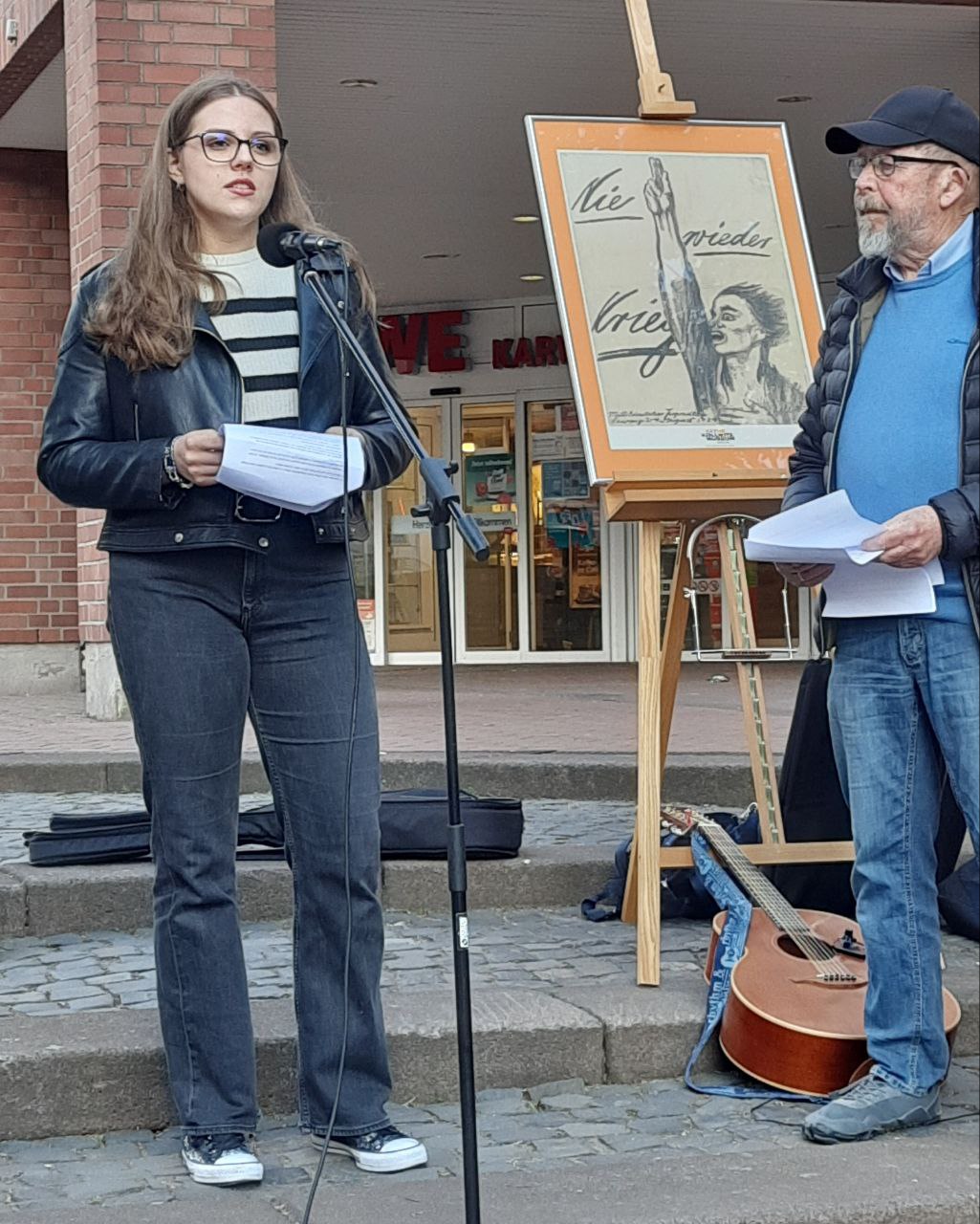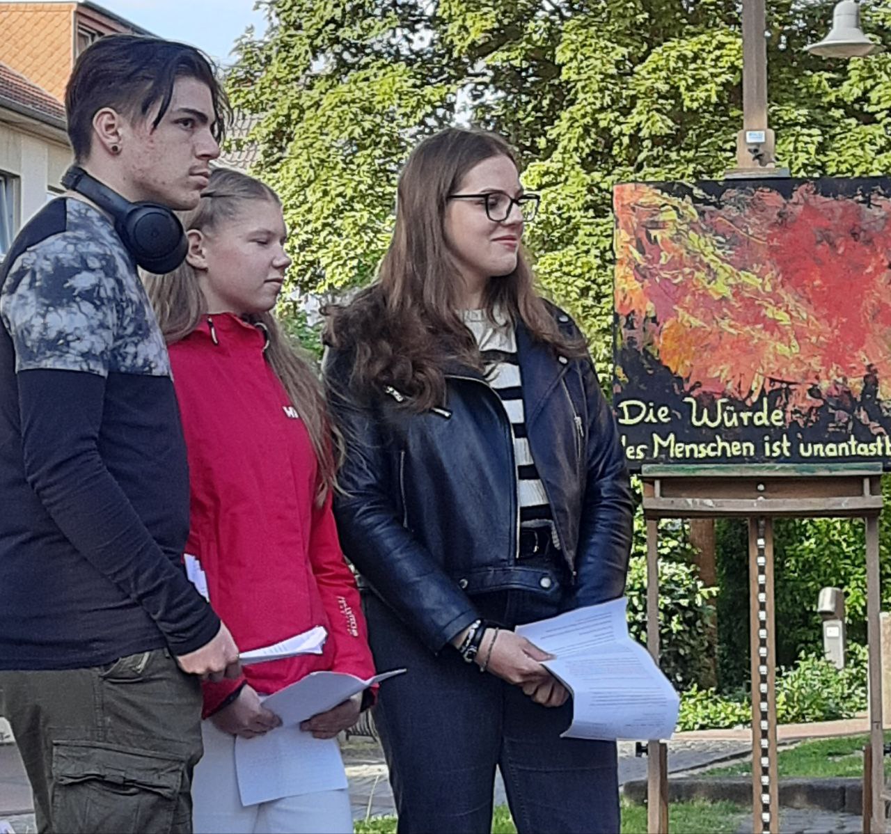 Einen bedeutenden Beitrag zur Veranstaltung leisteten die EF-Schülerinnen und Schüler des Marie-Curie-Gymnasiums. Emilie Beisenherz, Antje Bröker und Colin Wittwer rezitierten gemeinsam mit Inge Reiners-Woch, Jürgen Sprave und Irena Ufnalski zentrale Passagen aus der Rede des damaligen Bundespräsidenten Richard von Weizsäcker, die dieser zum 40. Jahrestag des Kriegsendes gehalten hatte. Seine klare und eindringliche Analyse der deutschen Schuld und der Folgen des Nationalsozialismus ist heute aktueller denn je.
