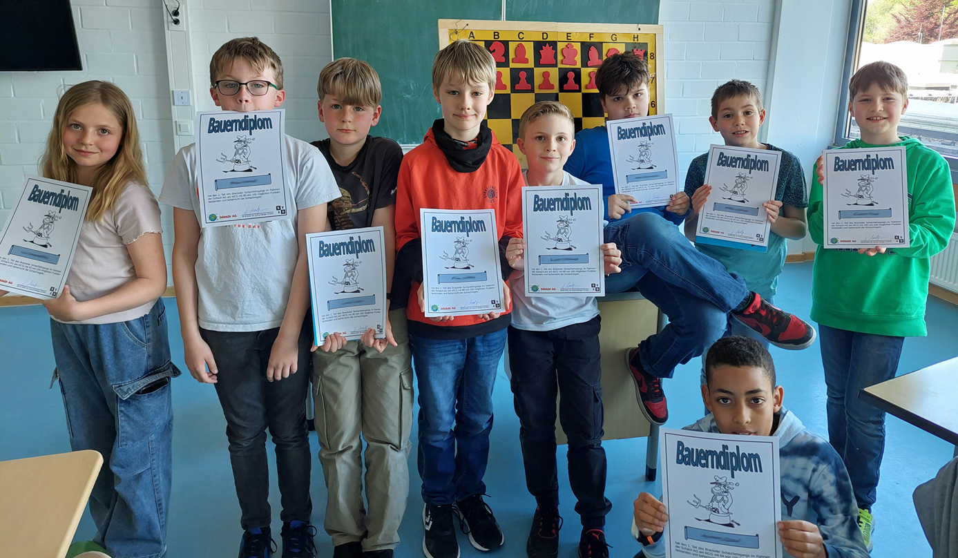 Nach 24 Unterrichtseinheiten und und insgesamt 14 absolvierten Lektionen legte die Einsteiger-Gruppe der diesjährigen Schach AG ihre Prüfung für das Bauerndiplom ab. Dabei ging es um das Erlernen und verfestigen der grundlegenden Schachregeln. Neben „Wie ziehen die Figuren?“ standen auch „Schach“, „Schachmatt“, „Patt“, „Rochade“ und die sogenannte „En passant“-Regel auf dem Stundenplan. Letztere ist eine Sonderzugmöglichkeit des Bauern und bedeutet „Schlagen im Vorübergehen“. Erfreulicherweise schafften alle neun Prüflinge den Abschluss und dürfen sich jetzt „ausgebildete Schachspielende“ nennen. Einmal konnte AG-Leiter Gernot Medger vom Schachverein Bönen sogar das Traumergebnis von 100 Punkten (von 100 möglichen) abzeichnen, aber auch weitere Ergebnisse in den 90er-Punktebereichen zeigten: ein toller Kurs!