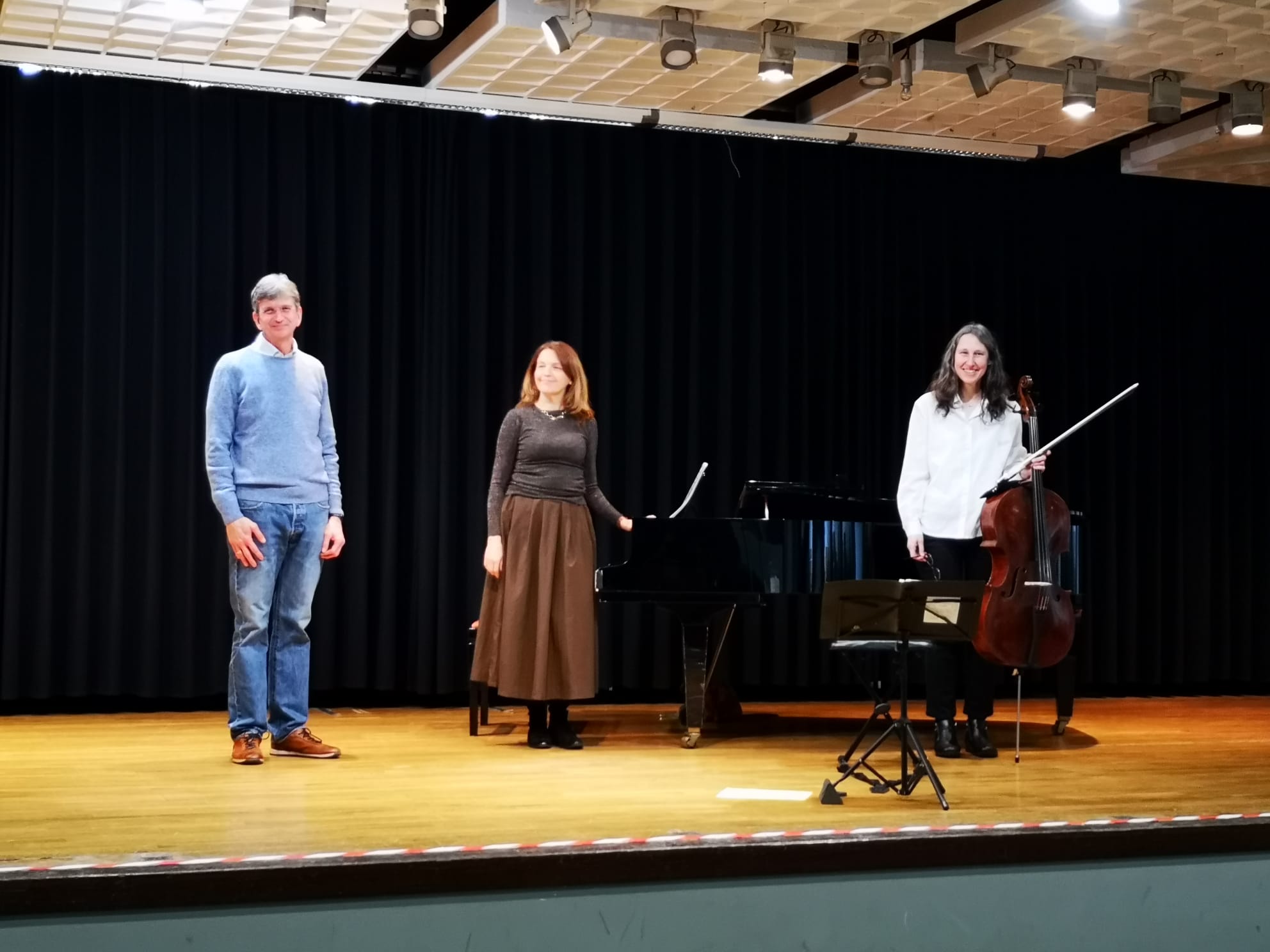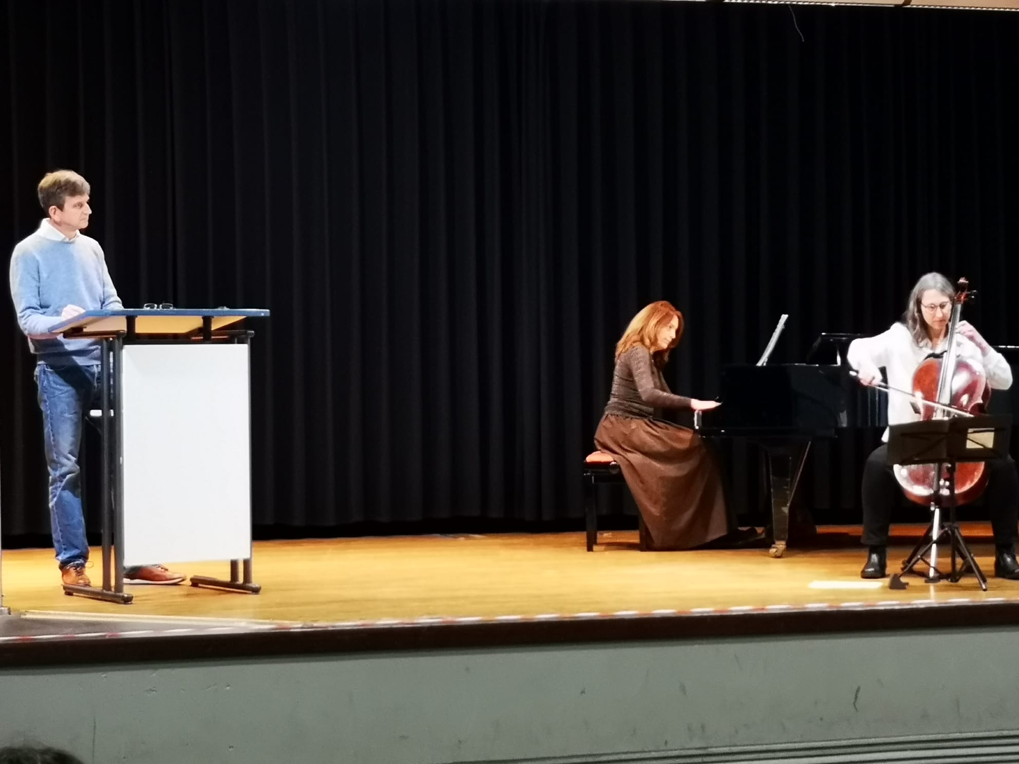Eine besondere Stunde durften die Klassen der Jahrgangsstufe 5 am Mittwoch in der Aula im MCG erleben. Die Geschichte vom Schneemann und der Schneefrau, die in der Weihnachtsnacht für einen kurzen Moment lebendig werden und glücklich zueinander finden, begeisterte die Schülerinnen und Schüler, was sie durch ihren langanhaltenden Applaus am Ende kund taten. Maßgeblich dazu beigetragen haben die passend zu der Geschichte ausgesuchten Musikstücke, die von Regine Overbeck am Violoncello und Larissa Blechmann am Flügel teils sehr feinfühlig, teils äußerst virtuos vorgetragen wurden. Der Text der Geschichte wurde von Matthias Overbeck einfühlsam vorgelesen. Die Schulleiterin Bianca Giese dankte den Ausführenden für ihr Engagement und für diese mittlerweile am MCG schon zur Tradition gewordene Veranstaltung, die schon seit dem Jahr 2012 die Herzen aller Zuhörerinnen und Zuhörer immer aufs Neue anrührt.